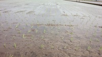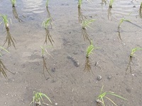 この時期の田んぼには様々な生き物達が集まり、雑草がたくさん生えてきます。雑草は稲の生育に支障がきたさない程度に除草できるのですが今、ジャンボタニシに若い苗が食べられて大変、悩んでいます。生息する多くの命を守る事で良い環境が生まれると考えたいところですが、辛いものです。田んぼを見渡しながら食べられて苗がなくなったところを見つけては手苗をしています。6月下旬まで手苗、タニシ駆除、水入れ作業を繰り返しながら苗を見守って行きたいと思います。