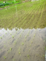 今年も天候に恵まれ例年通り、5月上旬に田植えが終了しました。先日、東海地方も梅雨入りとなり、田んぼの水入れも『一休み』といきたいところだったのですが、ちょっと問題が発生してしまいました。何が問題だったかというとタニシがお米の苗を食い荒らしている事が分かり、食い荒らされた場所にまた、苗を植える作業(手苗)をする事になった事でした。大変な作業でしたが根気よく手苗をして、なんとか現状回復できました。自然相手の仕事は何が起こるか予想も付きませんが、田んぼのパトロールを毎日、欠かさず行っていた為、最小限に被害で済みました。