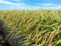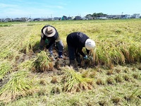 雨の日が続いた為、稲穂が寝てしまっているところが