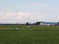 真名鶴が2羽、仲良く田んぼの虫たちを餌に食事を
