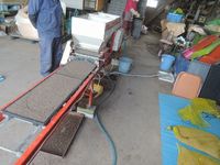 赤米脱穀作業。足踏み脱穀機です。