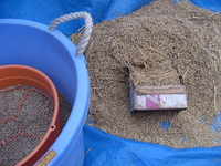いつもの足踏み脱穀機での脱穀ですが、脱粒しやすい品種なので、作業自体は楽です。