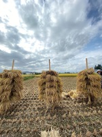 バインダーで稲を刈り取り、一束づつ稲杭に時計回りにかけていきます。