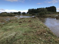 流木で水の流れが止まり、堤防が決壊し川の水が畑を流れている。