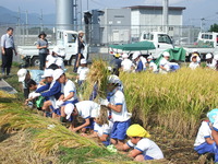 | 今年も小学3学年100名が体験稲刈りしました。 |
