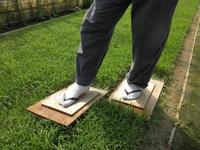 種播きから20日が過ぎ、稲の苗踏みをしています。これをすることで根も茎も太く丈夫な苗になります。ちなみに履いているのは私が加工した専用の下駄です。