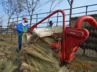 今日は天気が良かったので古代黒もちをはざから取り入れました。JAの支店長さんが完全武装で取入れ作業体験?????昨日の夜の会合の時、本日の作業の話をしたらぜひやってみたいとのことでした。お陰様でたいへん順調に作業を進めることができました。この藁はこのあと、しめ縄づくりやわら細工、さいのかみで活躍します。