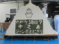 今年も中之島地区の産業まつりで新米コシヒカリ10俵600kgを使ったジャンボおにぎりが完成しました。海苔でできた蓮の妖精「ナカノン」はゆるきゃらグランプリ全国38位です。この後12,000個のおにぎりに分けおすそ分けしました。