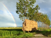 お見舞い申し上げます。当地では大きな被害はありませんが田んぼが柔らかく、閉口です。今日からコシヒカリのはざ架けようを刈り取ろうと思いますが?はざ架けの赤米のの前にきれいな虹が出ました。