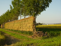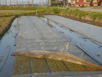 連日の好天のおかげで田んぼに並べたポット苗も芽が出そろいました。自然栽培では雀除けの網状のワリフのみで特に保温はしません。天候にもよりますが3〜4週間後の田植えになります。それに合わせて田んぼの準備になります。