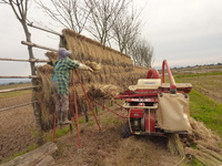 今年最後の屋外作業、古代黒モチの稲あげ脱穀です。私は撮影の為移っていませんが二人での連携手作業になります。この藁はしめ縄やわら細工になります。