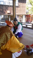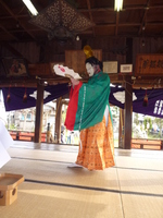 笛の合間に撮った写真ですのでなかなかうまく取れません。タイを釣って恵比寿、大黒が仲良く分け合う舞です。最後にお餅、お菓子を撒きます。