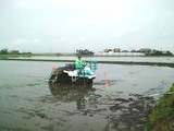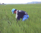 関東はまだ梅雨明けしていないものの、晴れているときは30℃を超える日がほとんどです。そんな中での田の草取りは過酷なんです。気温もそうですが、前かがみでの移動で背中にはじりじりと太陽が照りつけ、水面からはムッとくる蒸気が。逃げ場になるような日陰などもちろんありません。ひたすら前に進むのみです。この時期のヒエもしっかりと根付いており、簡単には抜けません。往復しては休み、往復しては休み。汗でびしょびしょになりながらの作業です。汗をかいた分水分補給は十分とっておかなくてはなりません。水分補給量がリットル単位になることも珍しくありません(苦笑)。こんな感じでがんばってますよ〜。