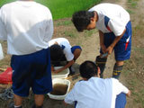 先日、田んぼの学校と題して城之内中学校の皆さんと一緒に、田んぼに住んでいる生き物を観察しました(^^♪