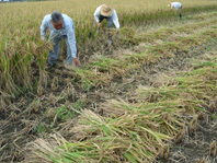これは稲刈り。稲を刈る音です。身が落ちないよう、大切に一株一株、収穫します」