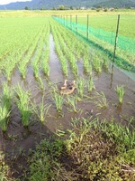 苗が根付いてからアイガモを田に放します。