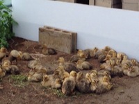 田んぼに入れる予定のアイガモ君たちはビニールハウスの中で待機中です。