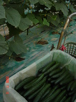 美味しい新しいキュウリをプレゼントに添えられます。抑制キュウリは、年内で収穫を終えます。