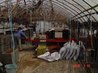第2ハウスでは、キュウリの収穫中です。気温が低いとあまり生長しませんが、太陽が出て、気温が上昇すると生長が早くて大変です。もぎ残すと翌日は、お化けのように大きくなってしまいます。(^_^;)