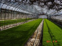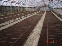 盛り上がった土を鎮めるために丁寧に一枚一枚、水をかけます。これからは、伸びすぎないように注意しながら、水をきらさないように管理します。ハウスのサイドに冠水チュウーブが通してあって、水のコックを開けるとハウス内全体にシャワーが霧のように噴出して苗全体に均一に水がかかるようになっています。