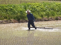 田植えから約一週間経った現在、農場主は写真のような除草作業をしています。