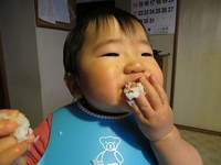 両手にご飯を握りしめて、口に押し込んで食べています。