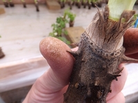 秋に収穫したタラノキを温泉の熱で暖めるハウスに入れて、芽を出させます。ハウスに入れて1週間ぐらいで、褐色の固い芽が膨らんで、緑色が見えてきました。