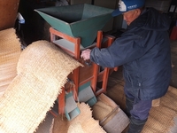 写真は、籾から取れた芒などのほこりを取り除くため、風選機(唐箕(とうみ))で選別している様子です。