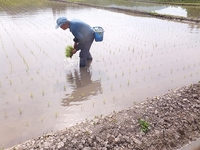 田植え機で植えた後、苗がうまく植わらなかったところ、苗が足りないところに植えていきます。