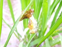 田んぼで、トンボの羽化が始まりました。通常、朝方から羽化するのですが、雨天の今日は、午後から羽化するトンボがいました。除草剤を使用している田んぼでは、トンボが生まれませんが、農薬を使用していない田んぼでは、沢山のトンボが生まれます。元気に育ち、また、田んぼに帰ってきて欲しいものです。まだまだ序盤、ピーク時には、生まれたてのピカピカ光る羽を羽ばたかせ、沢山のトンボが飛び立ちます。