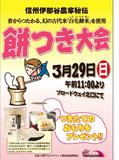 東京の中野ブロードウェイ(中野駅北口)にて、白毛餅の餅つき大会をすることになりました。当日は、「信州・パノラマ伊那市 観光物産展と白毛餅つき大会」ということで、白毛餅のほかにも伊那市の物産が色々と並ぶそうです。