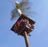 白毛餅の農民組合です。上伊那地方の農村に伝わる風習・奇習は本当にたくさんあります。写真は伊那市西箕輪の上戸(あがっと)集落に鎌倉時代から伝わるとされる大文字(でえもんじ)の棹です。五穀豊穣・無病息災を祈るため、長さ12メートルの柱に、大文字と呼ばれる、もみ殻を入れたきんちゃく袋をつるします。
